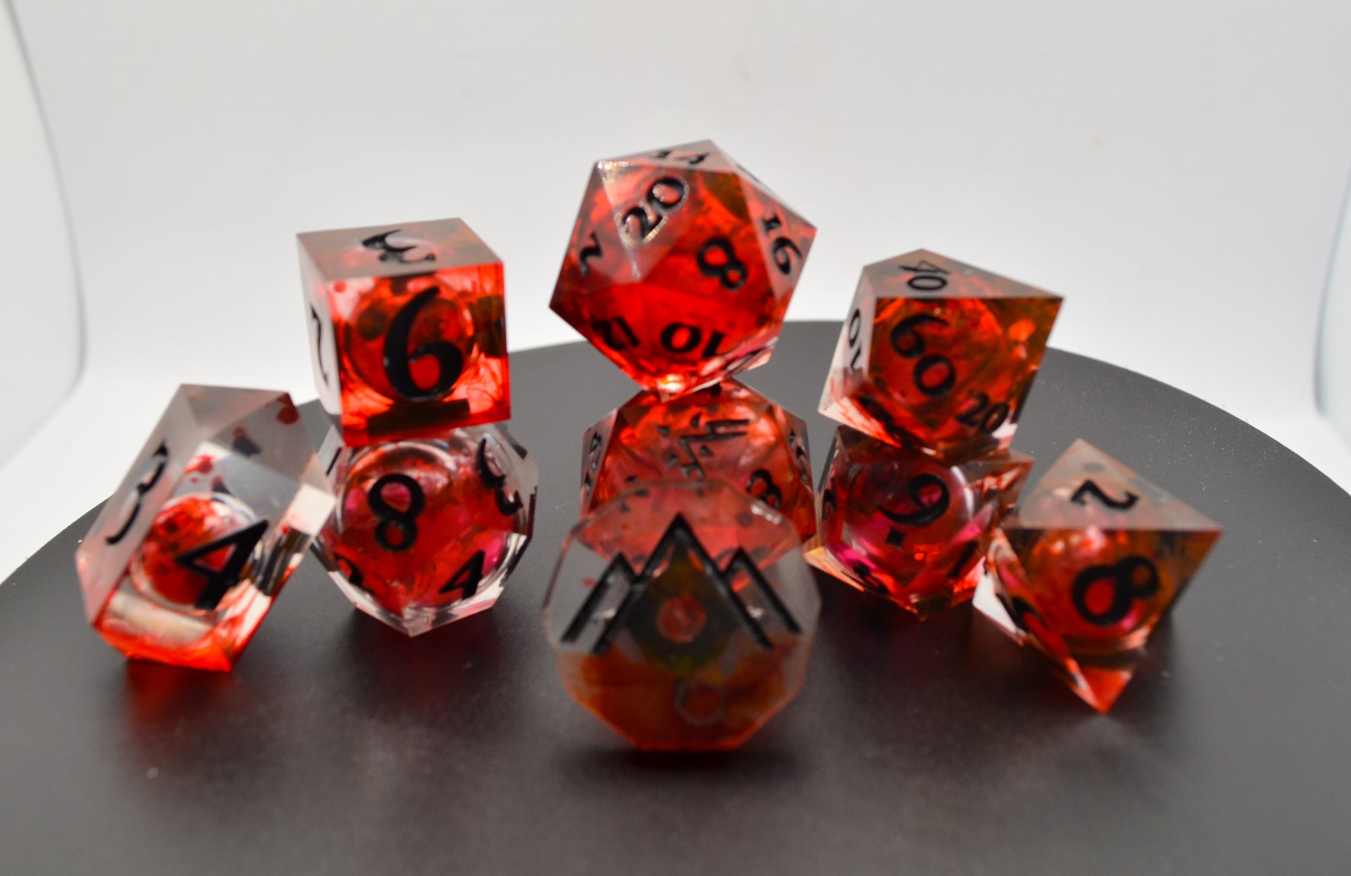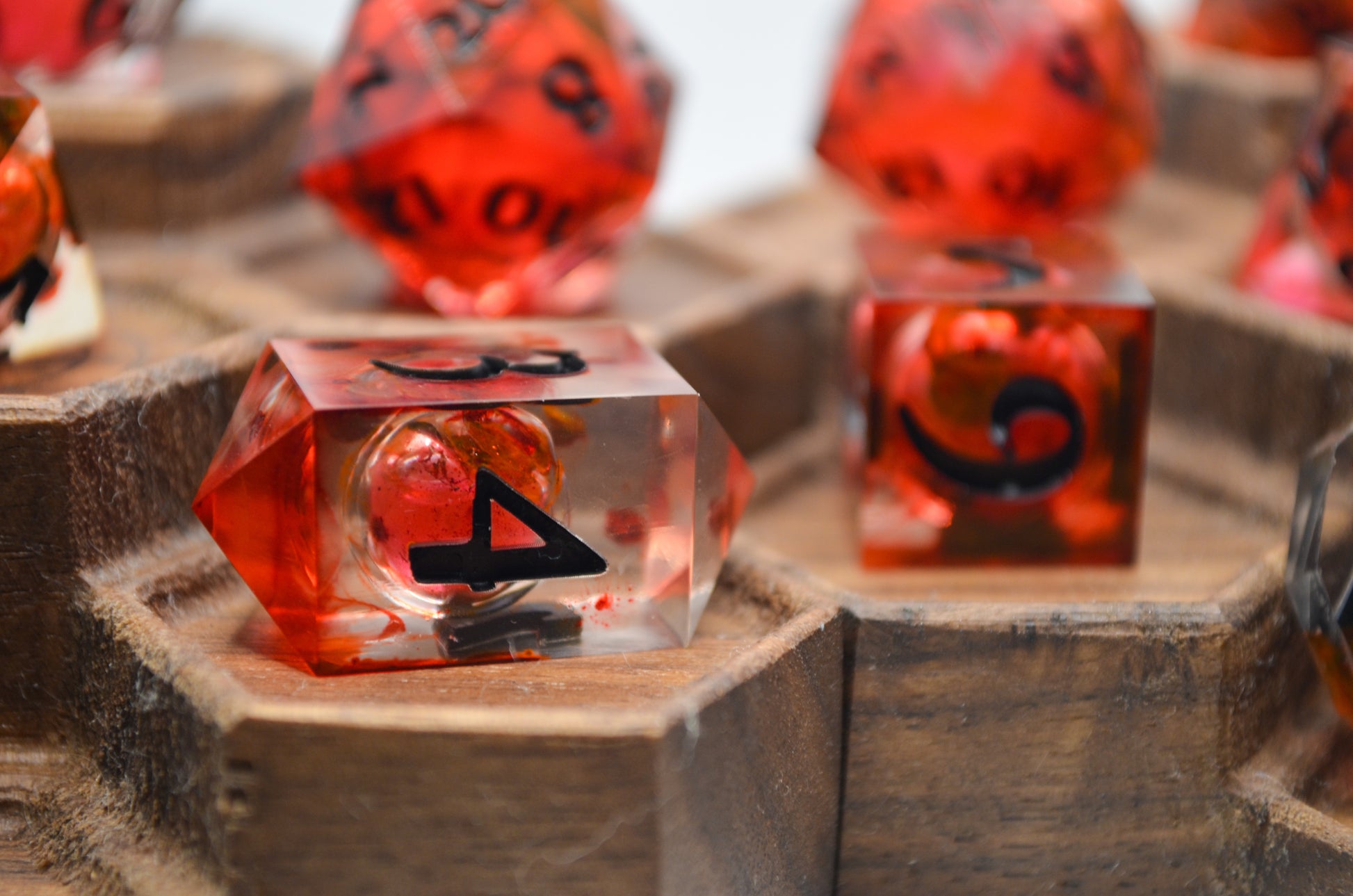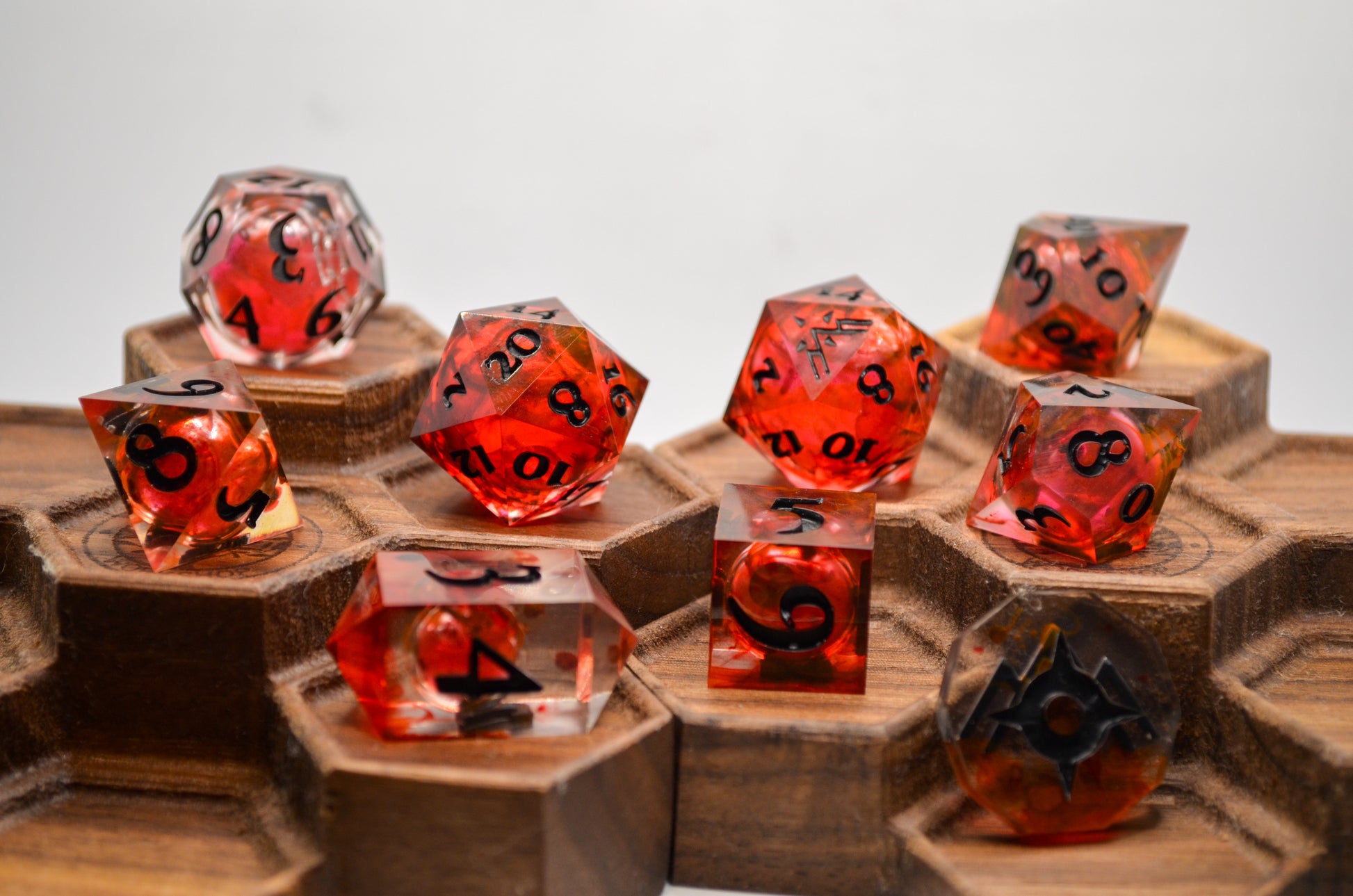 This full 9 piece set features swirling blood red liquid cores in a blood splatted shell. The numbers are inked in black!