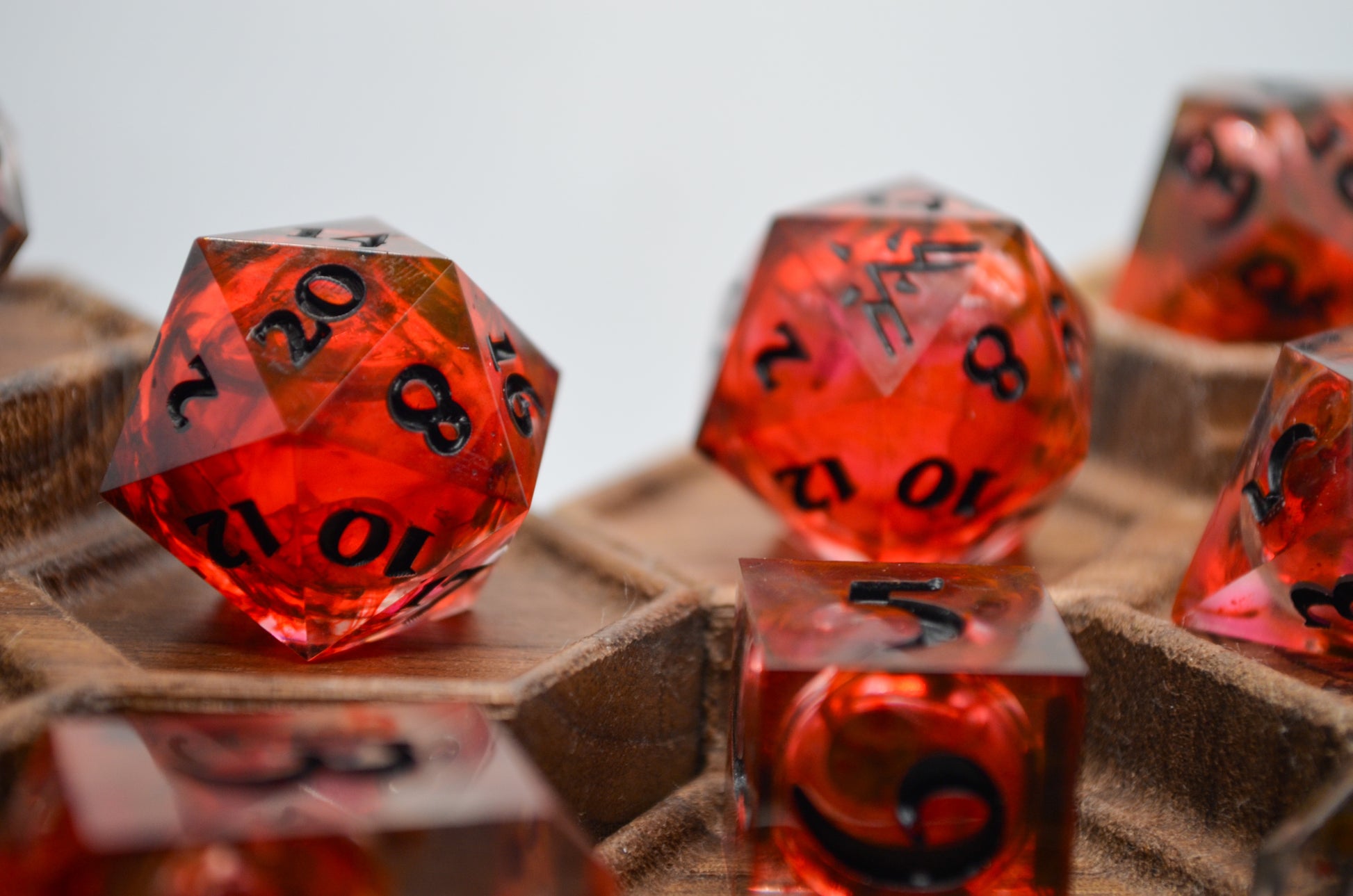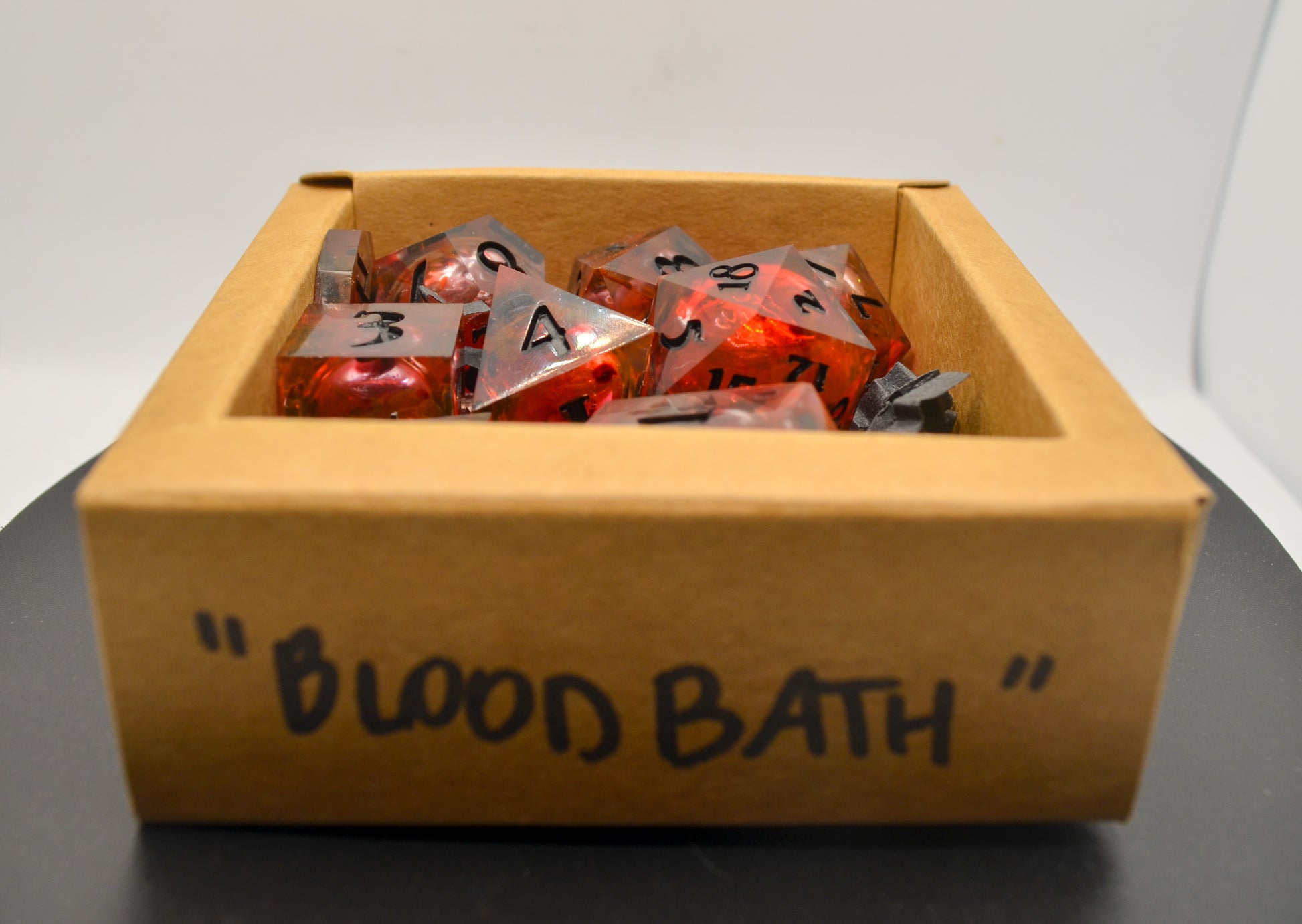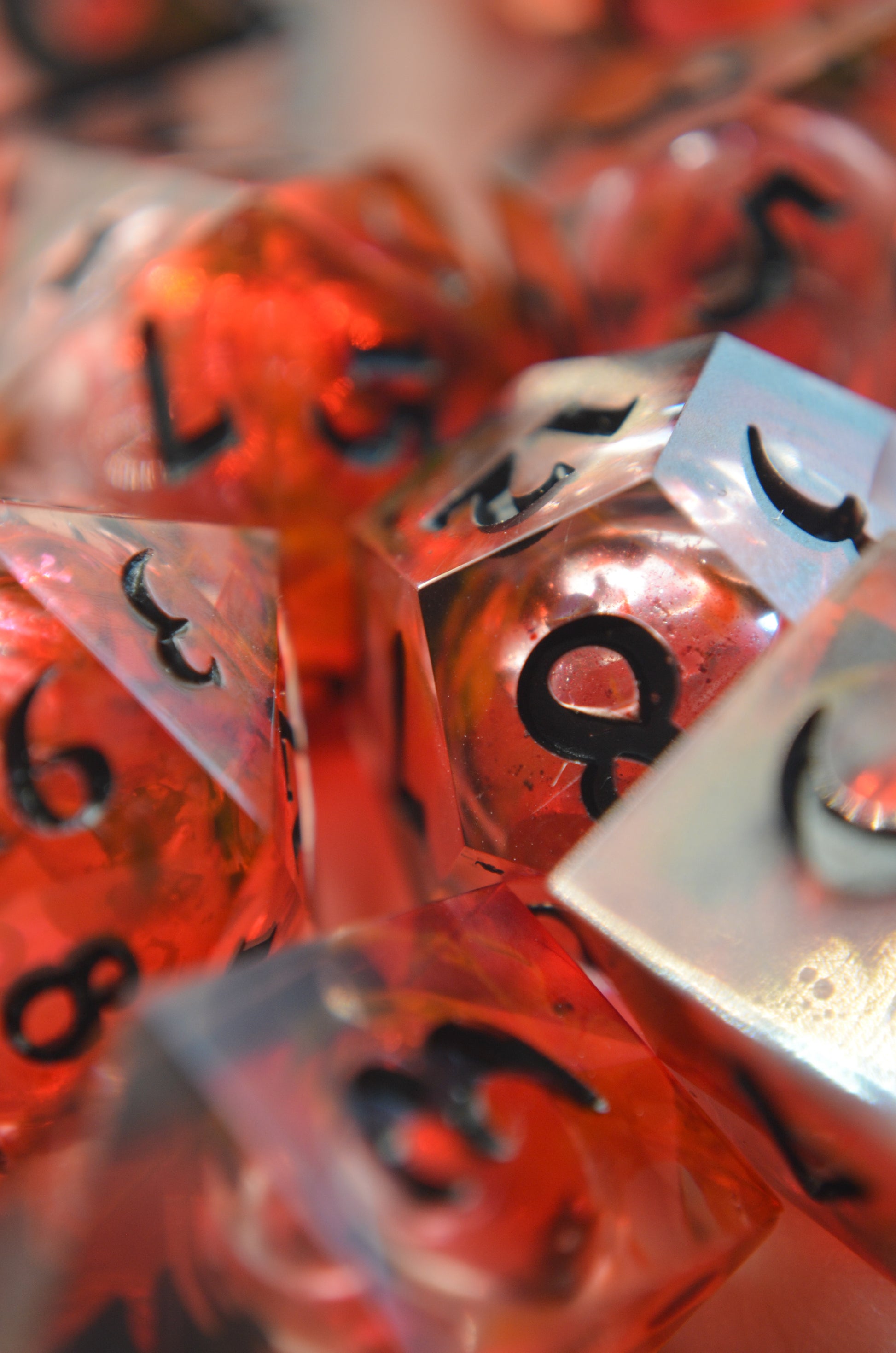 This full 9 piece set features swirling blood red liquid cores in a blood splatted shell. The numbers are inked in black!