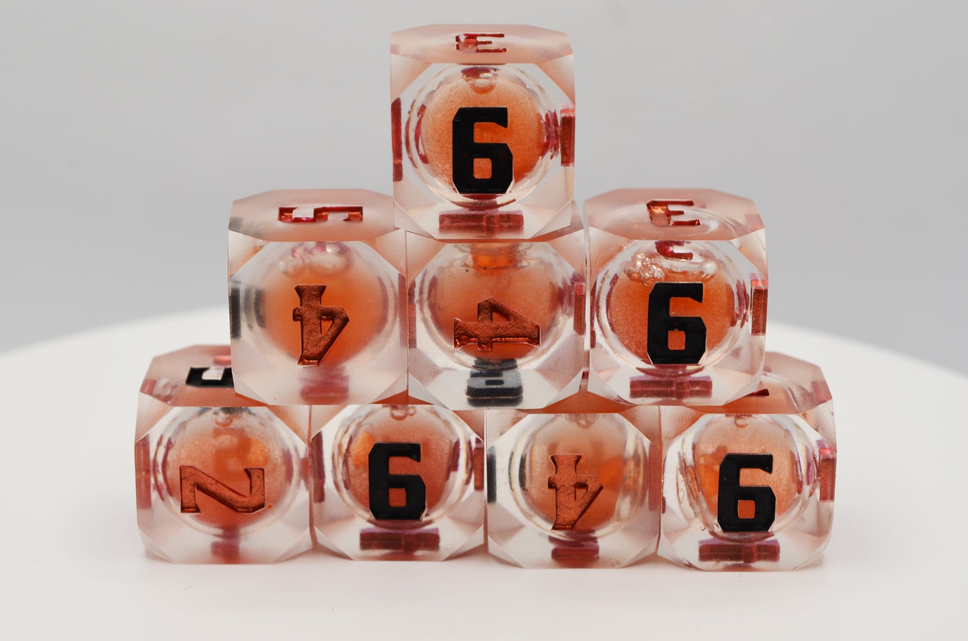 This set was created using a fiery orange liquid core! See the "fire" swirl when you roll damage! The high face of each die is inked in black and the rest are inked in metallic fire opal.