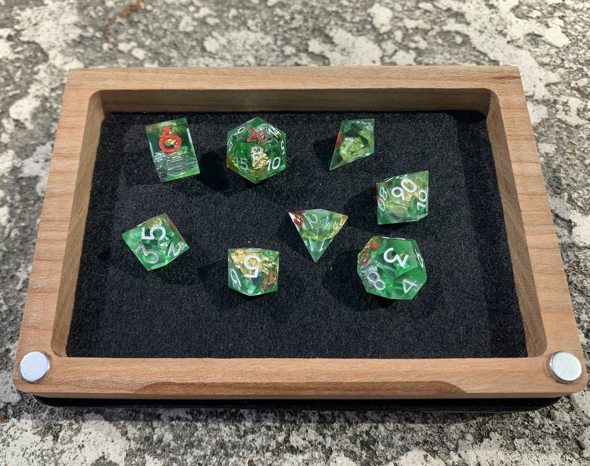 Roll with adventure with this tiny set based on Nott The Brave! This set is transparent goblin green with silver and gold foil inclusions. The numbers are inked in white, with the high face on each die inked in red.