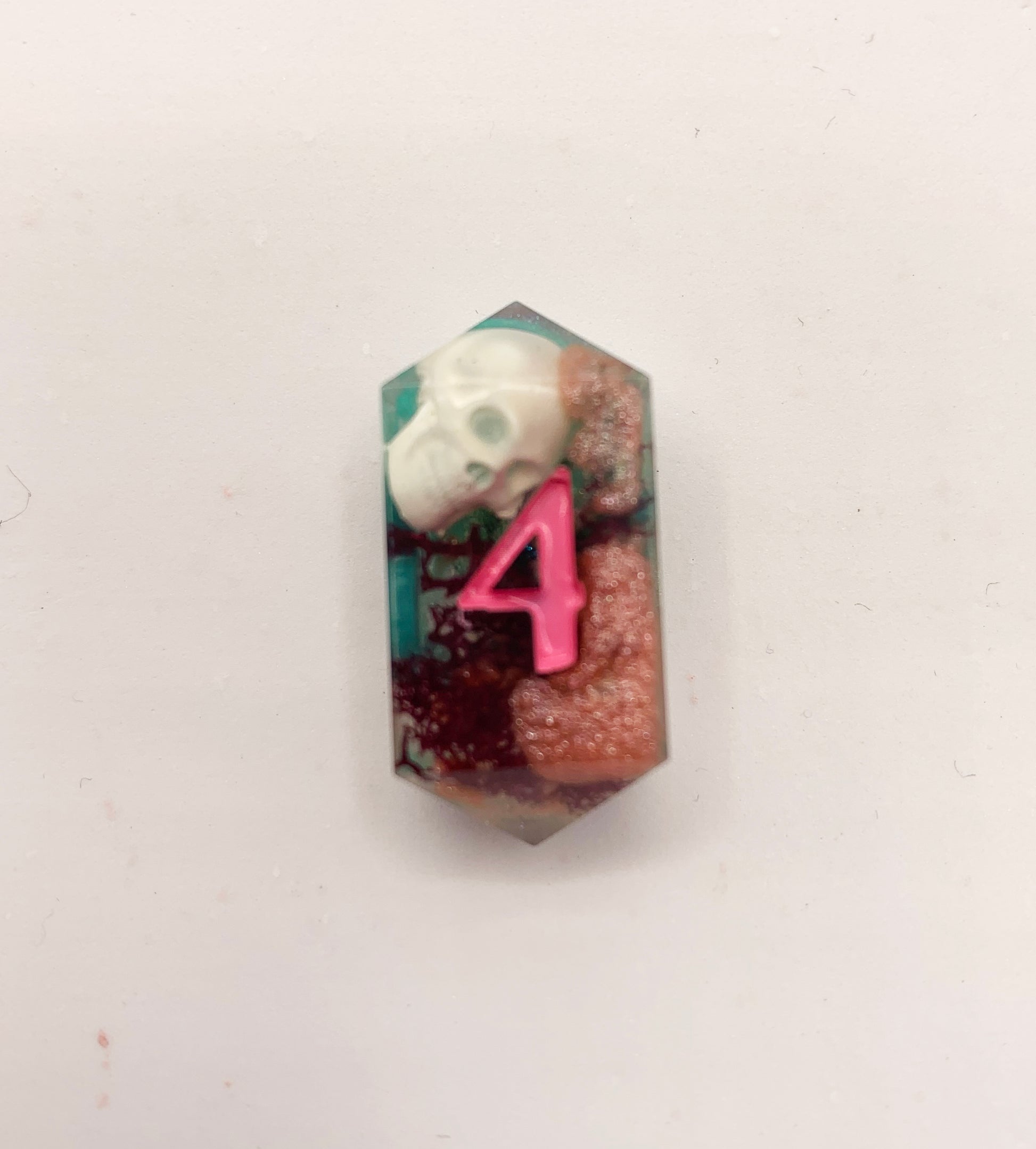 These dice feature tiny skulls made out of resin which preserves the balance of the set.