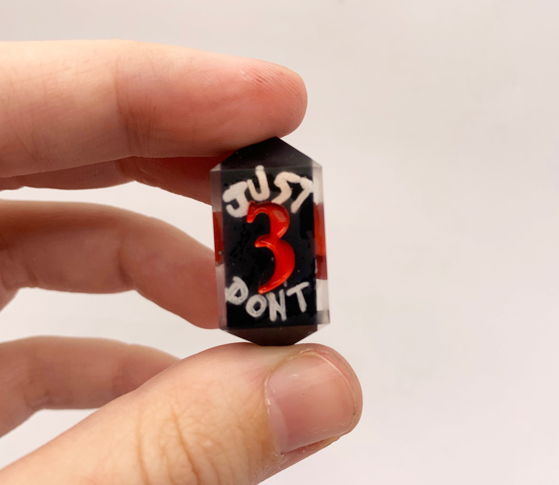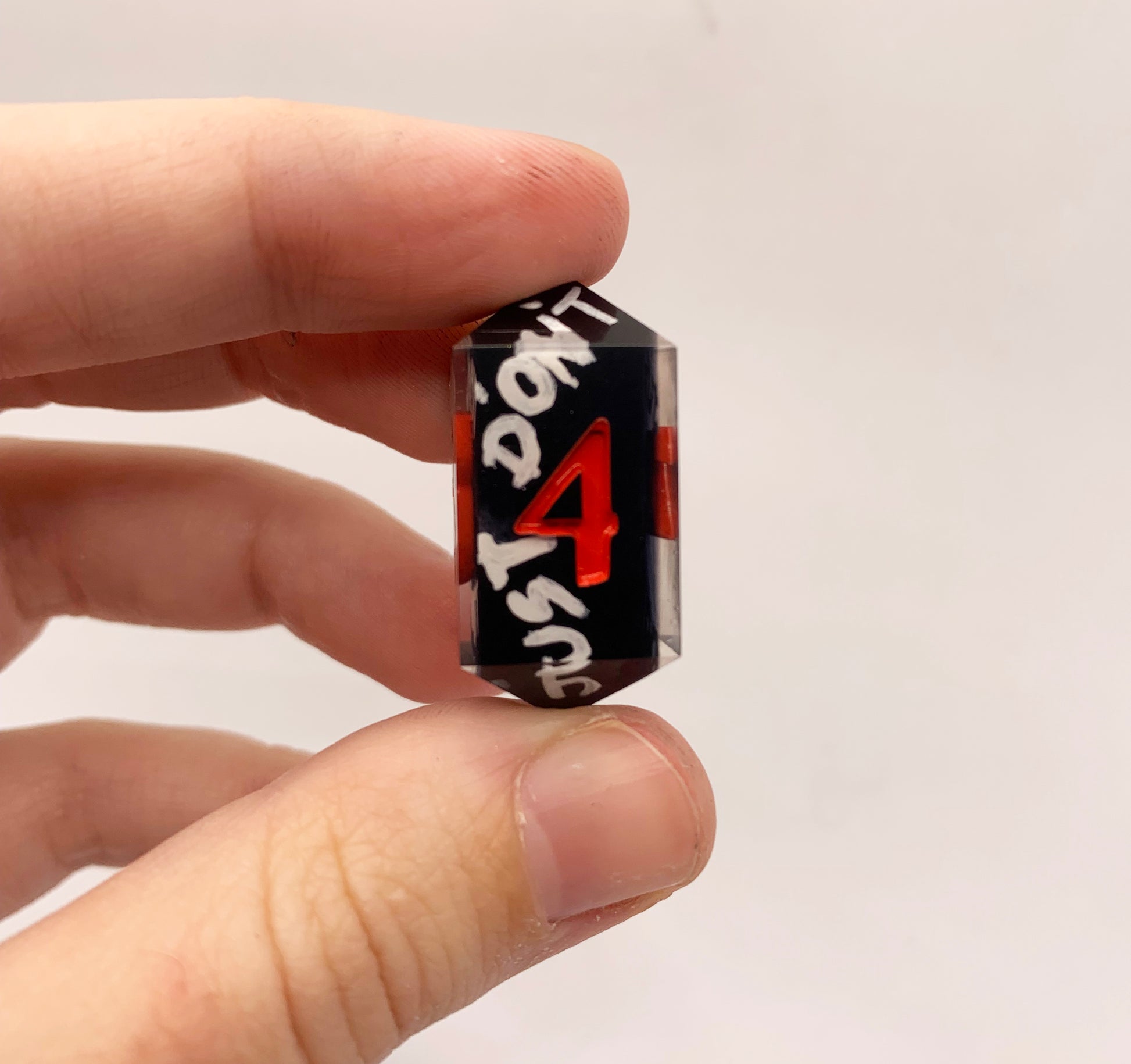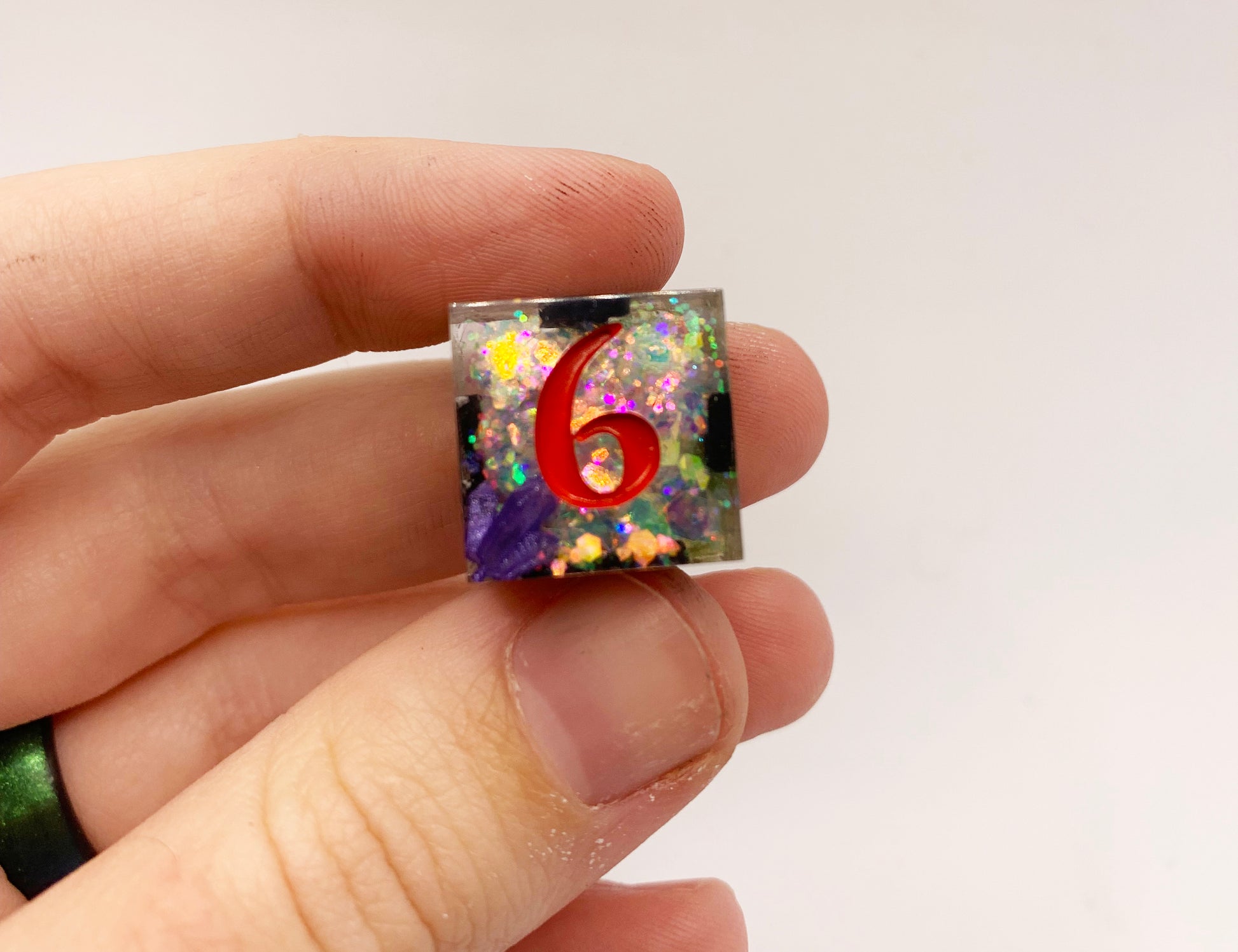 These dice feature tiny hand painted purple crystals made out of resin which preserves the balance of the set, opalescent glitter, a swirl of dark green, AND a hand painted crystal style D4 based on Ashton's jacket!