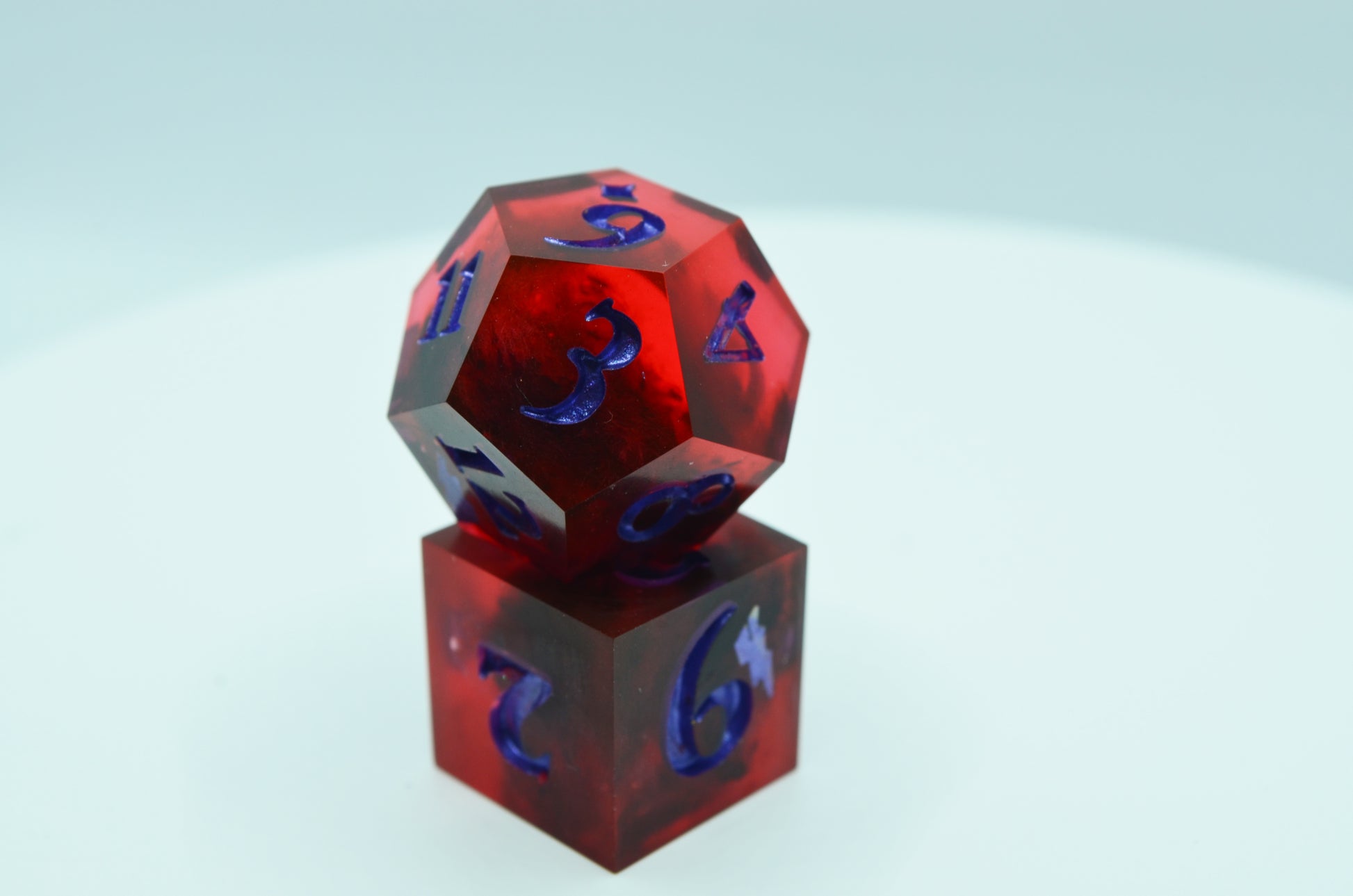 I really wanted to capture the roiling storms of Imogen's dreams with this set! Each piece features swirls of red "clouds" and a tiny purple lightning bolt on the highest face. The numbers are inked in a matching metallic purple!