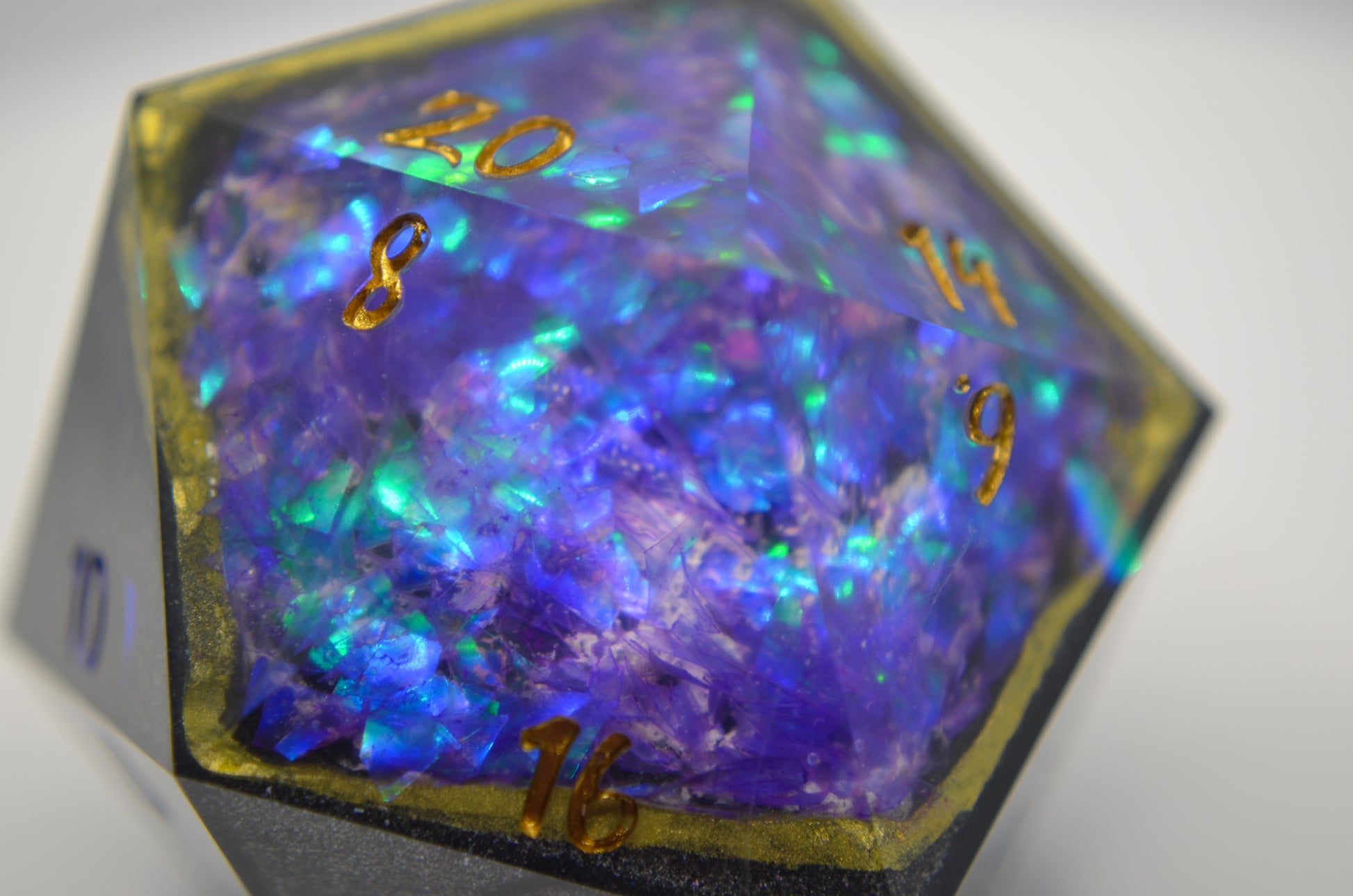 This huge d20 features a stone gray base with a purple mylar geode center! The numbers have been inked in gold!